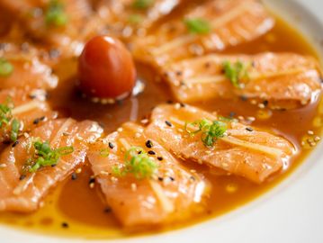 lightly seared salmon, cherry tomato, garlic puree, ginger, chives, sesame seed/oil, yuzu soy sauce 23