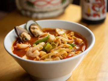 Thick noodles in spicy chicken broth with shrimp, scallop, squid, mussel, and veggies