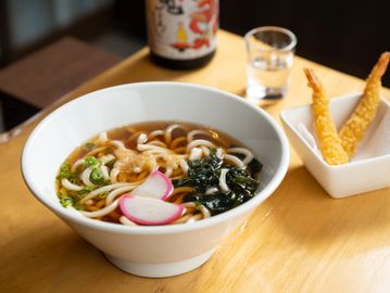 thick noodles, fish broth, fish cake, seaweed, scallion, 2pcs of shrimp tempura