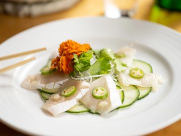 Salmon, sliced lemon, krab mix, cucumber, cilantro, ponzu